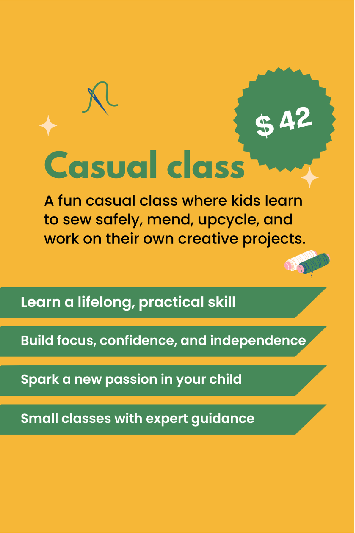 Our casual sewing classes run at the same time as our full-term program and are ideal for families who prefer flexibility, or for children trying sewing for the first time before committing to a full term.